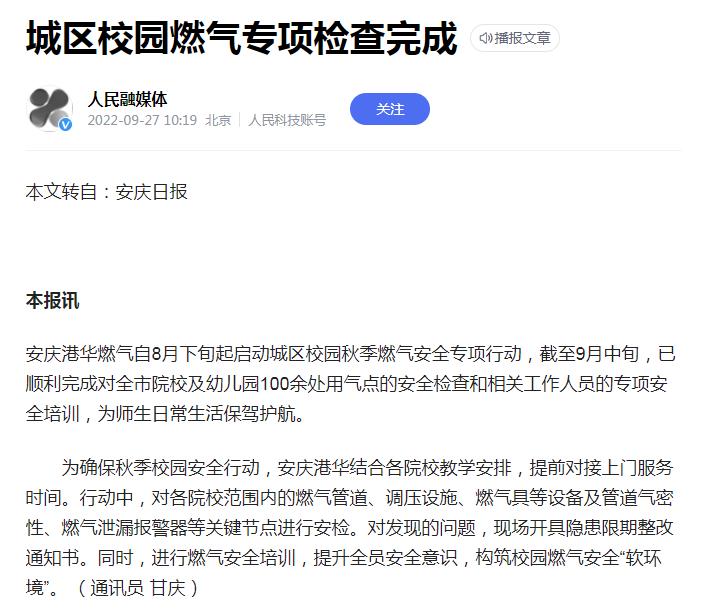 城區(qū)校園燃氣專項檢查完成(轉(zhuǎn)載于人民網(wǎng)融媒體)