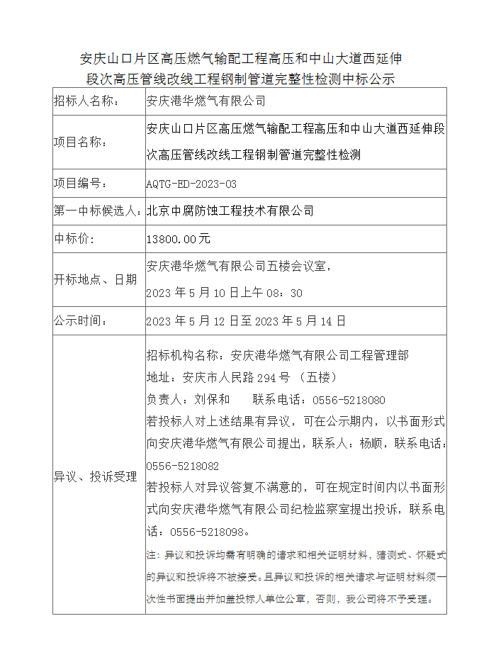 安慶山口片區(qū)高壓燃?xì)廨斉涔こ谈邏汉椭猩酱蟮牢餮由於未胃邏汗芫€(xiàn)改線(xiàn)工程鋼制管道完整性檢測(cè)中標(biāo)公示