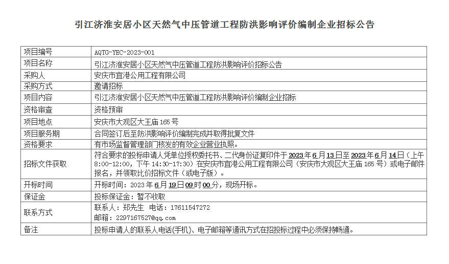 引江濟(jì)淮安居小區(qū)天然氣中壓管道工程防洪影響評(píng)價(jià)編制企業(yè)招標(biāo)公告