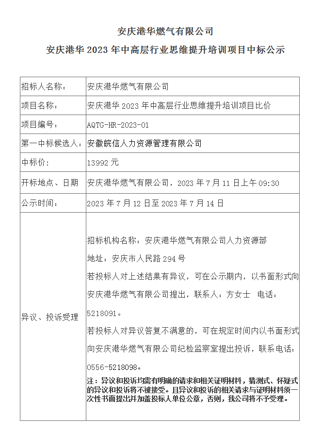 安慶港華2023年中高層行業(yè)思維提升培訓(xùn)項(xiàng)目中標(biāo)公示