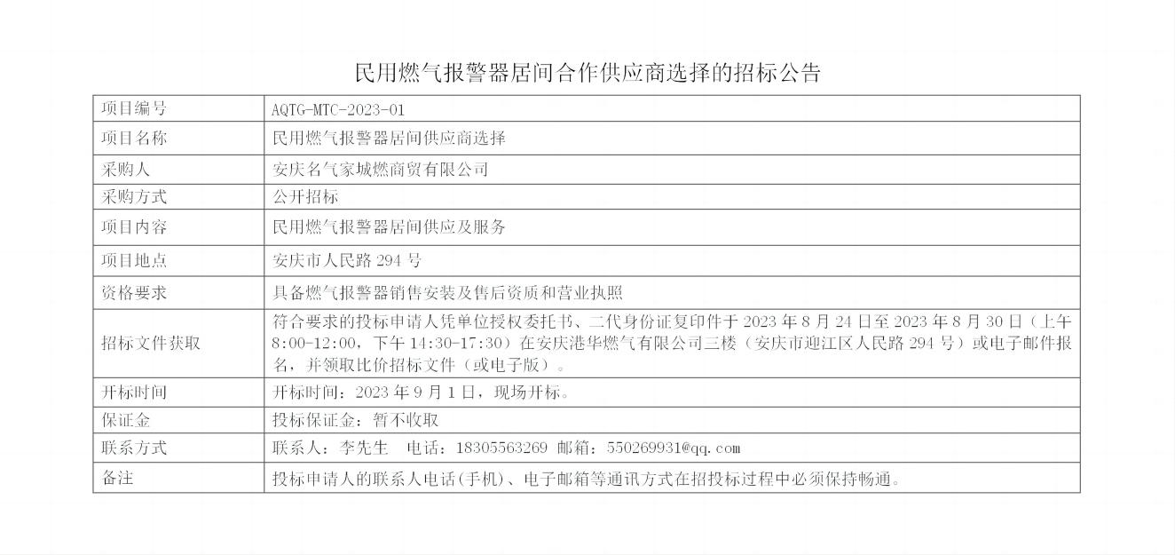 民用燃氣報警器居間合作供應商選擇的招標公告
