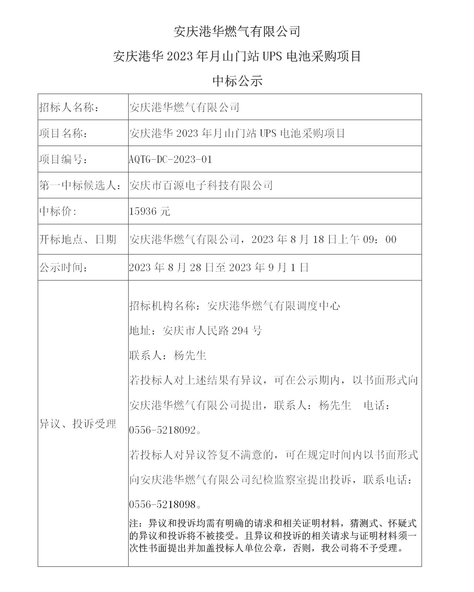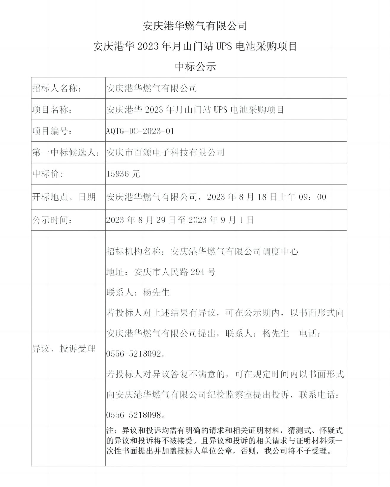 安慶港華燃?xì)庥邢薰?安慶港華2023年月山門站UPS電池采購項目 中標(biāo)公示