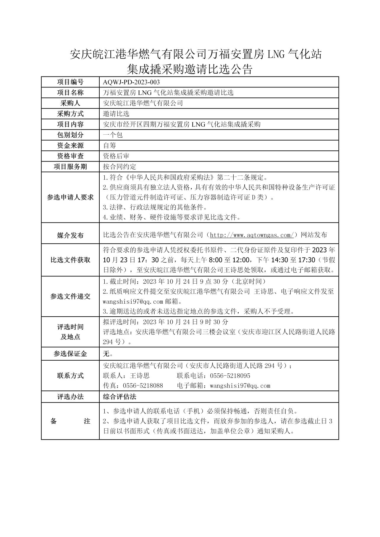 安慶皖江港華燃?xì)庥邢薰救f福安置房LNG氣化站集成撬采購邀請比選公告