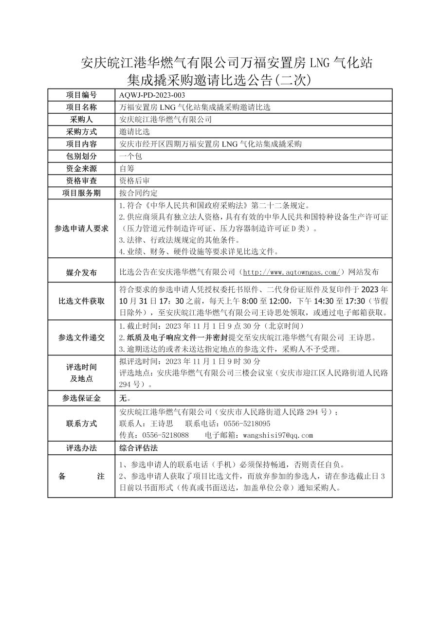 安慶皖江港華燃?xì)庥邢薰救f(wàn)福安置房LNG氣化站集成撬采購(gòu)邀請(qǐng)比選公告(二次)