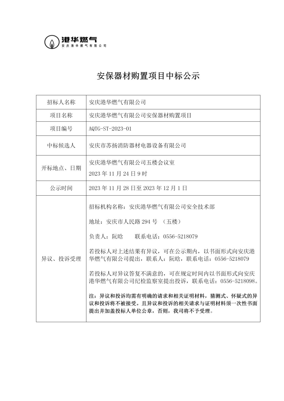 安慶港華燃?xì)庥邢薰?023年安保器材購置項目中標(biāo)公告