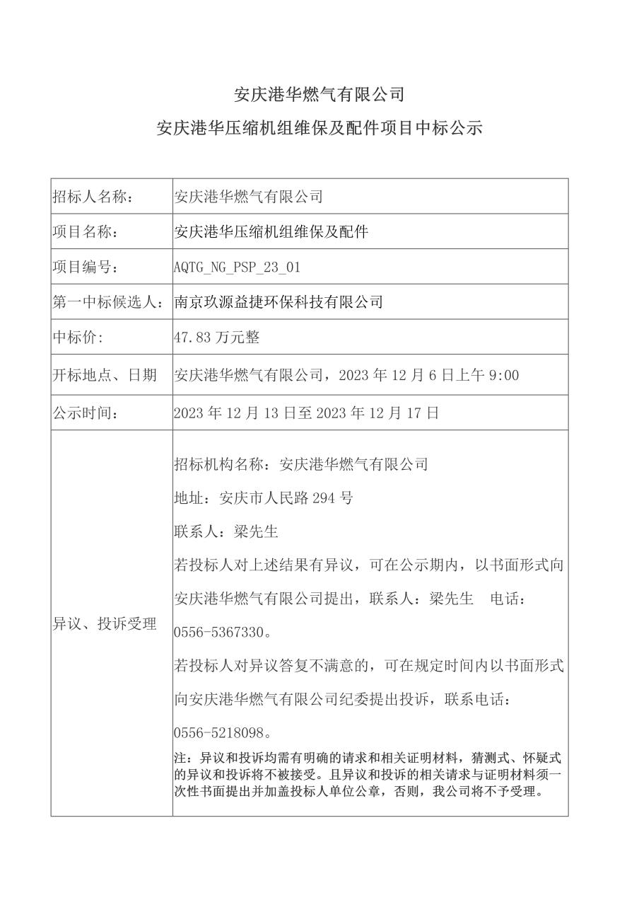 安慶港華壓縮機(jī)組維保及配件項目中標(biāo)公示