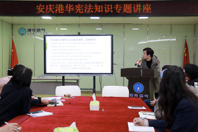 組織20余名員工代表開展憲法專題講座,以《中華人民共和國憲法》《勞動法》《城鎮(zhèn)燃?xì)夤芾項l例》及誠信合規(guī)相關(guān)法律法規(guī)的解讀和案例詳解為主要內(nèi)容,進(jìn)行法律宣講。