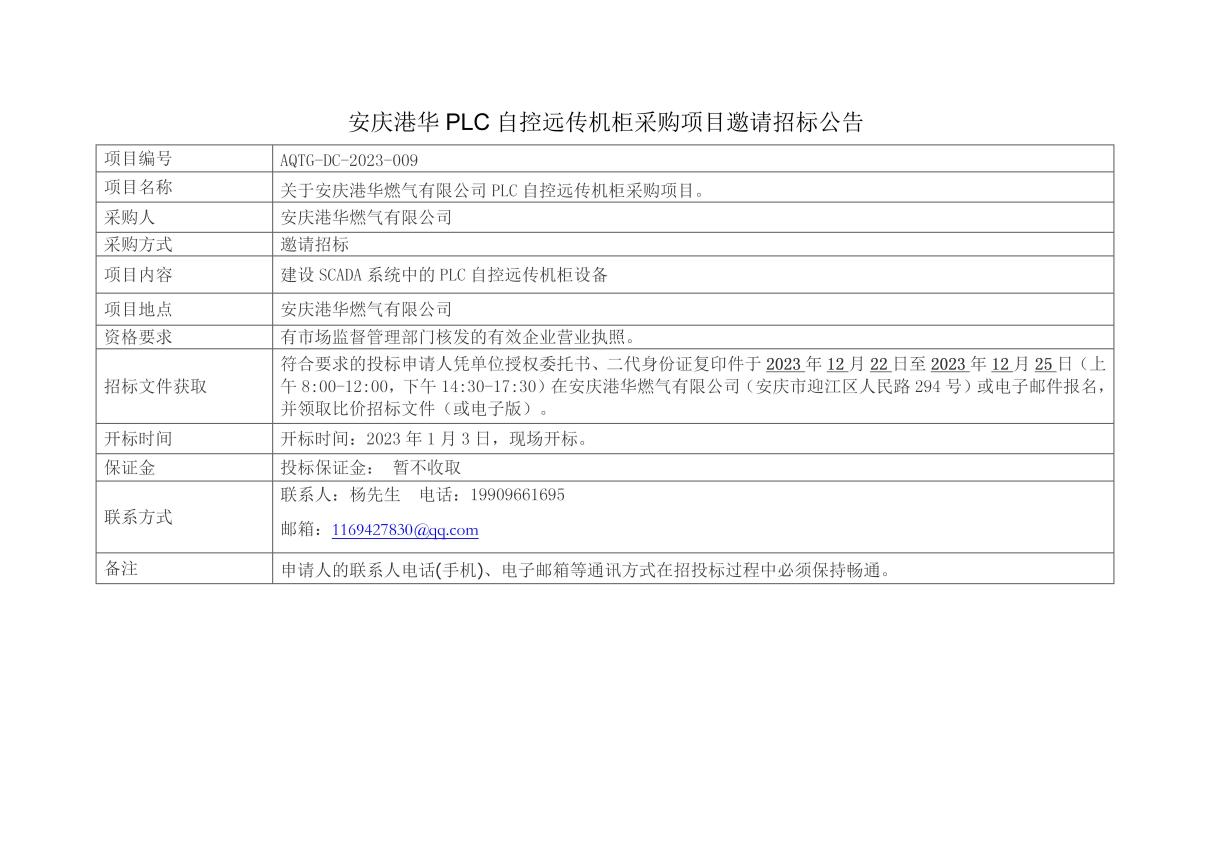 安慶港華PLC自控遠(yuǎn)傳機(jī)柜采購項(xiàng)目邀請招標(biāo)公告