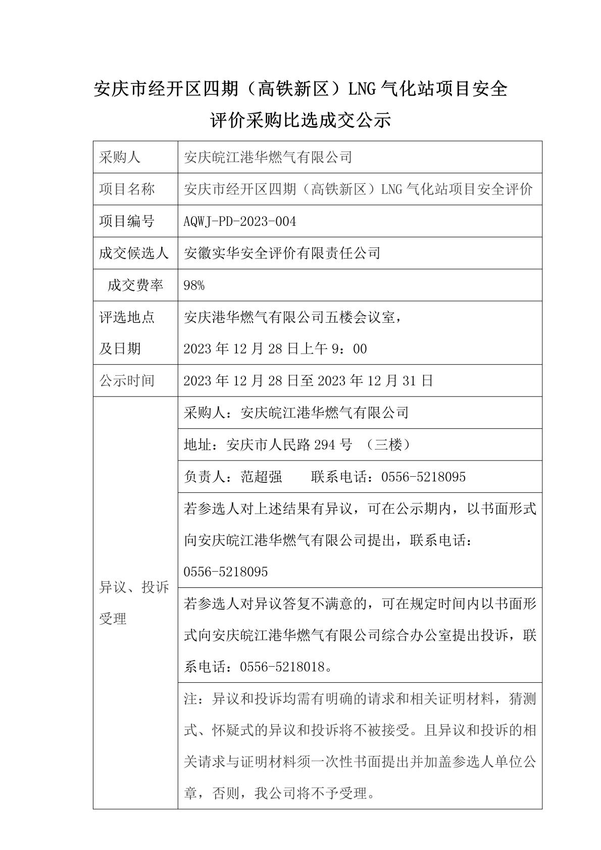 安慶市經開區(qū)四期(高鐵新區(qū))LNG氣化站項目安全評價采購比選成交公示