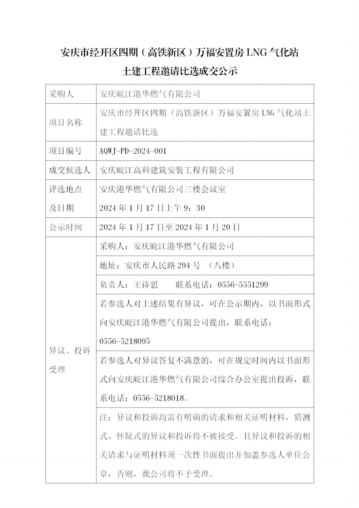 安慶市經(jīng)開(kāi)區(qū)四期(高鐵新區(qū))萬(wàn)福安置房LNG氣化站 土建工程邀請(qǐng)比選成交公示