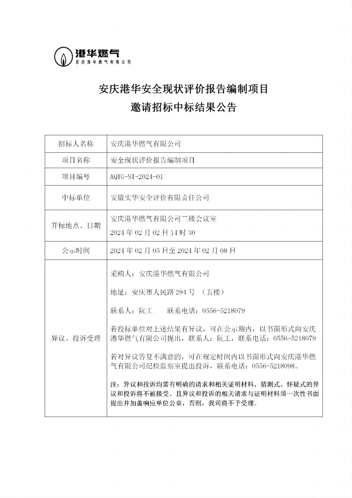 安慶港華安全現(xiàn)狀評價報告編制項目邀請招標中標結果公告