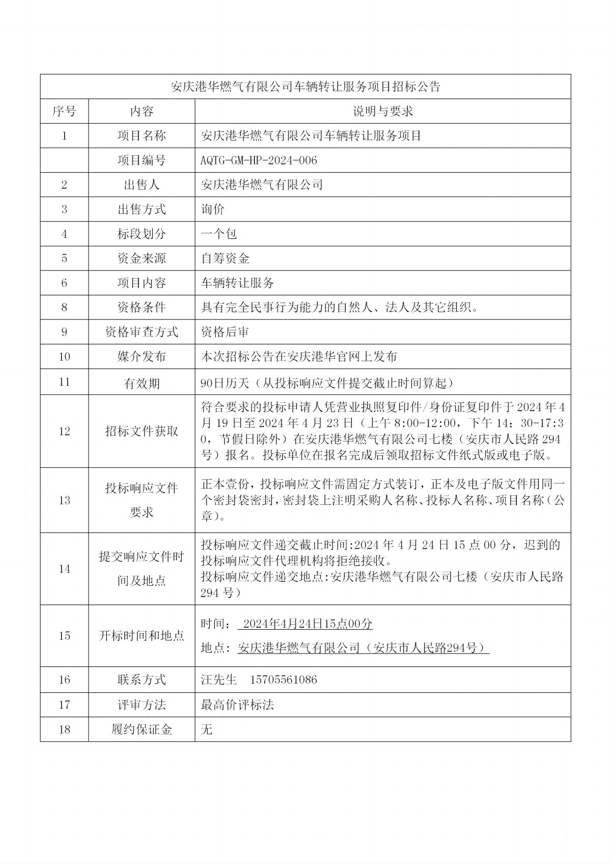 安慶港華燃?xì)庥邢薰拒?chē)輛轉(zhuǎn)讓服務(wù)項(xiàng)目招標(biāo)公告