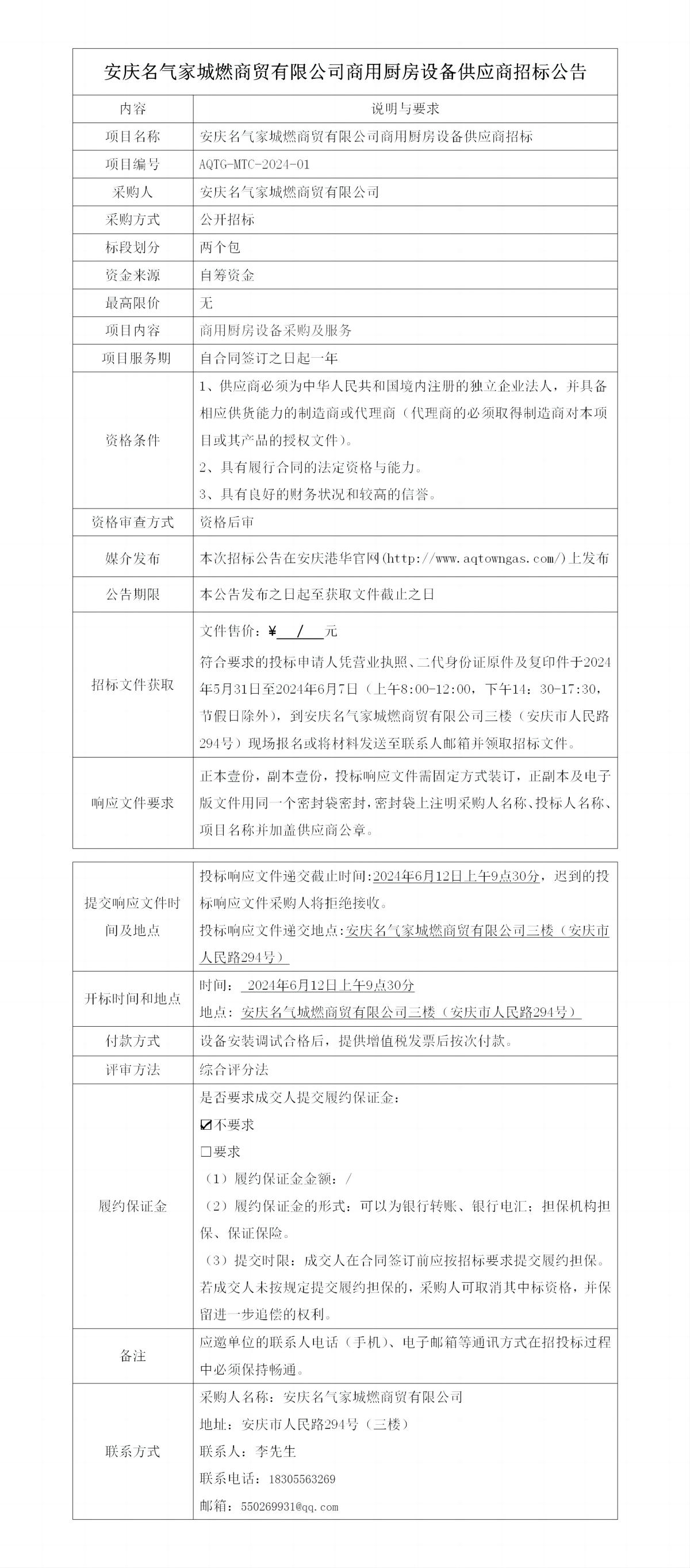 安慶名氣家城燃商貿(mào)有限公司商用廚房設(shè)備供應(yīng)商招標公告