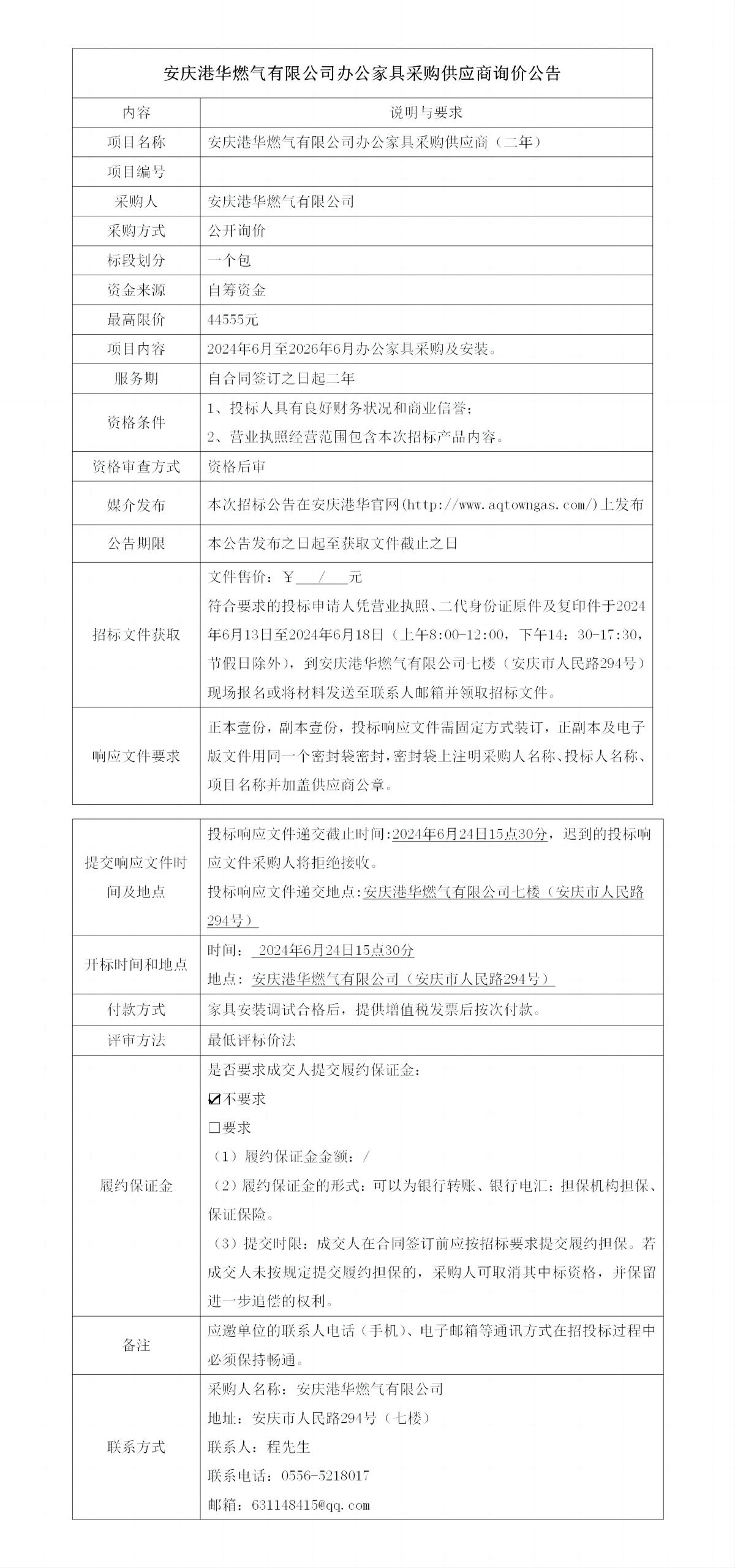 安慶港華燃?xì)庥邢薰巨k公家具采購供應(yīng)商詢價(jià)公告