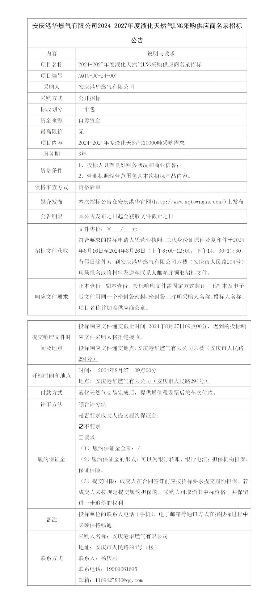 安慶港華燃?xì)庥邢薰?024-2027年度液化天然氣LNG采購(gòu)供應(yīng)商名錄招標(biāo)公告