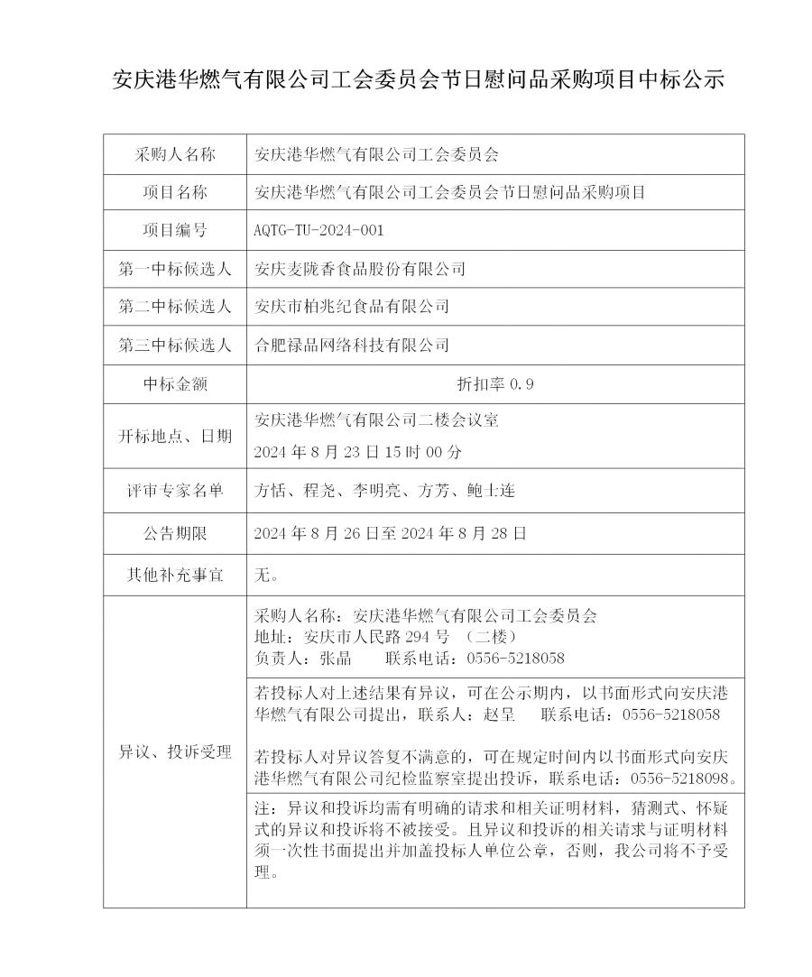 安慶港華燃氣有限公司工會委員會節(jié)日慰問品采購項目中標(biāo)公示