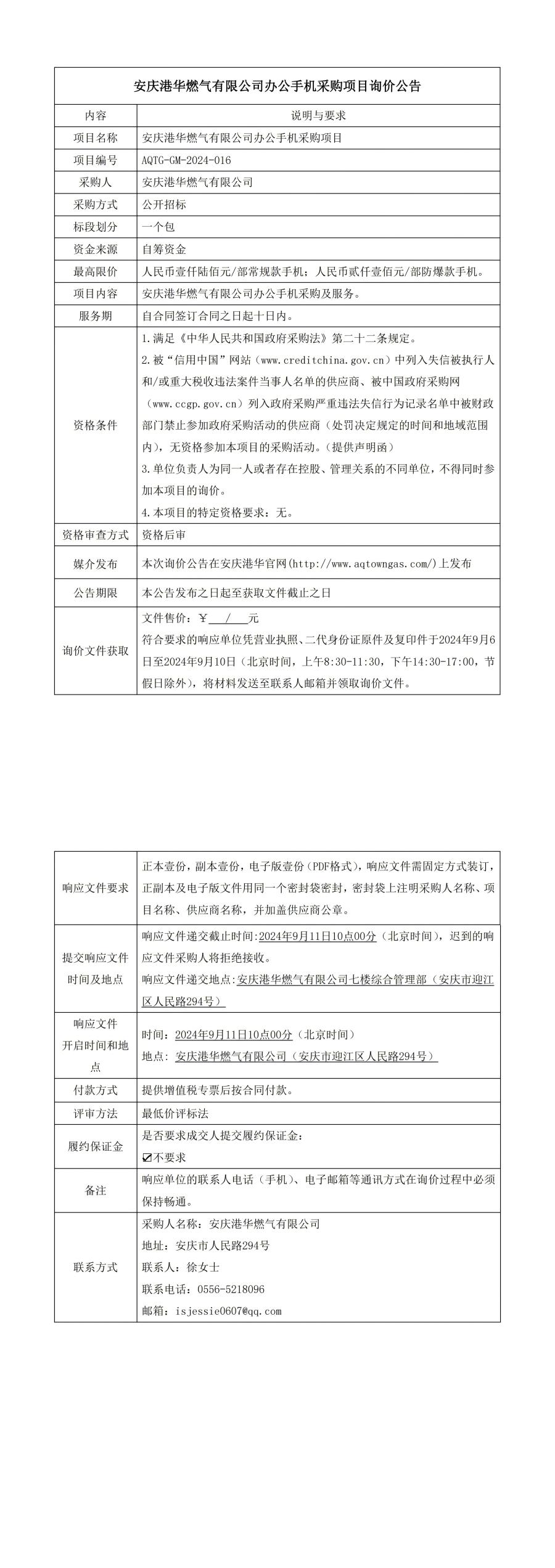 安慶港華燃?xì)庥邢薰巨k公手機(jī)采購項目詢價公告