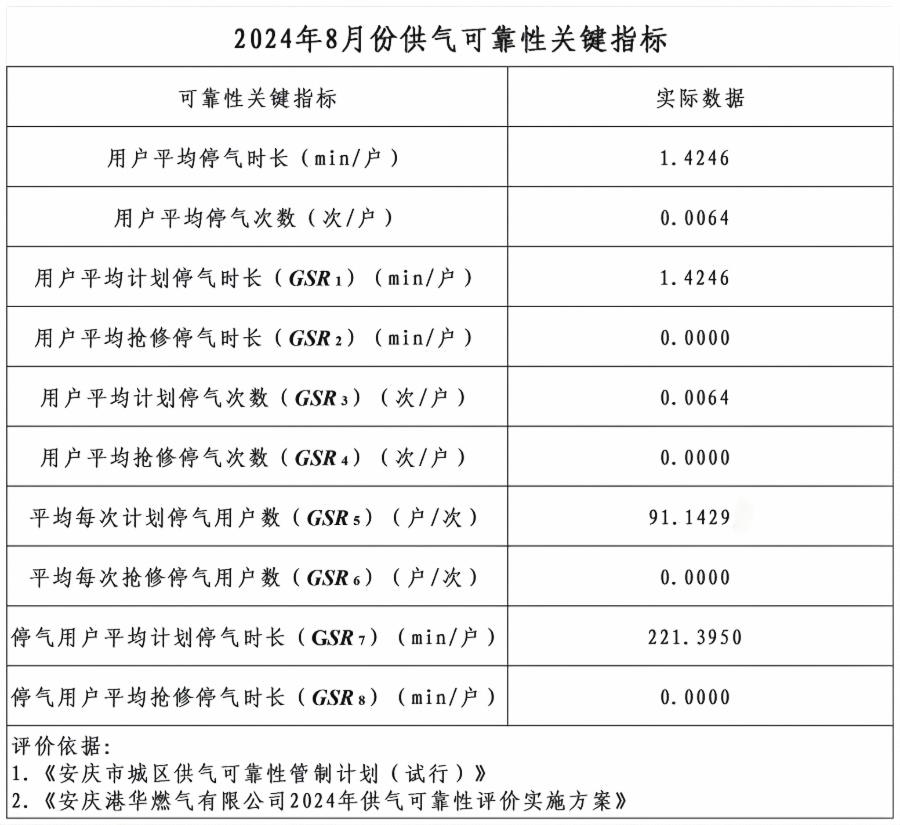 2024年8月份供氣可靠性關(guān)鍵指標(biāo)