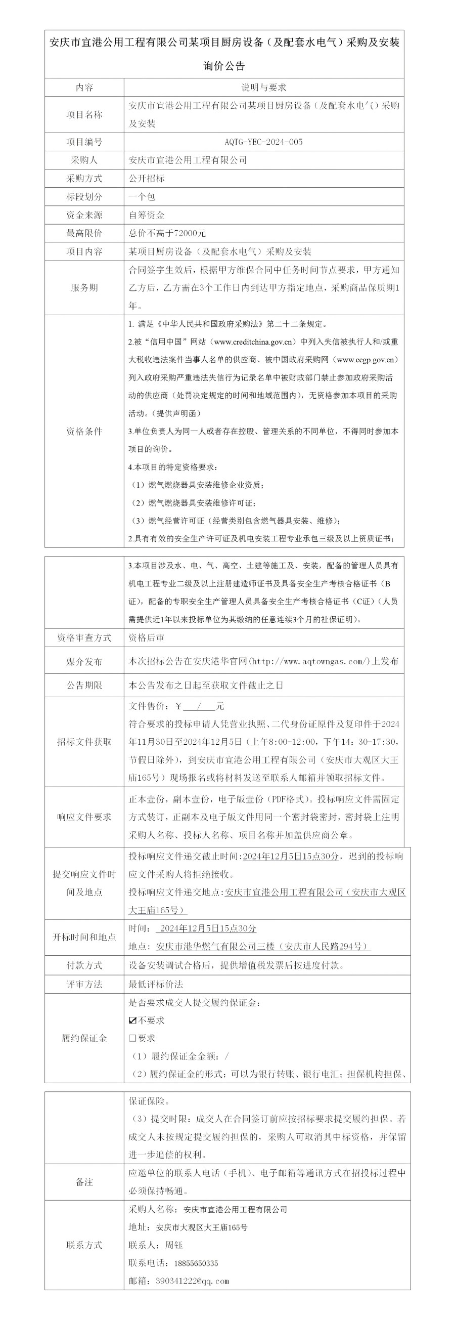 安慶市宜港公用工程有限公司某項(xiàng)目廚房設(shè)備(及配套水電氣)采購及安裝詢價(jià)公告
