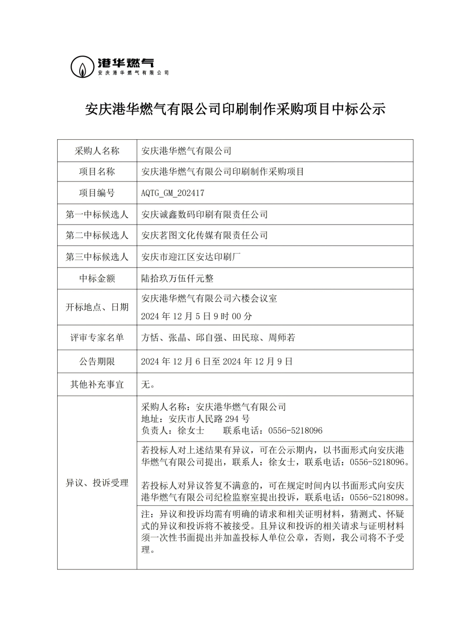 安慶港華燃氣有限公司印刷制作采購項目中標公示