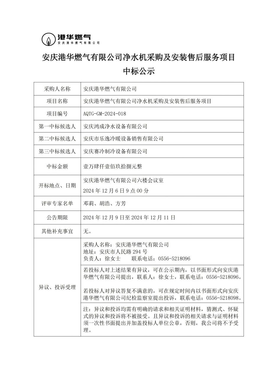 安慶港華燃氣有限公司凈水機采購及安裝售后服務(wù)項目中標公示