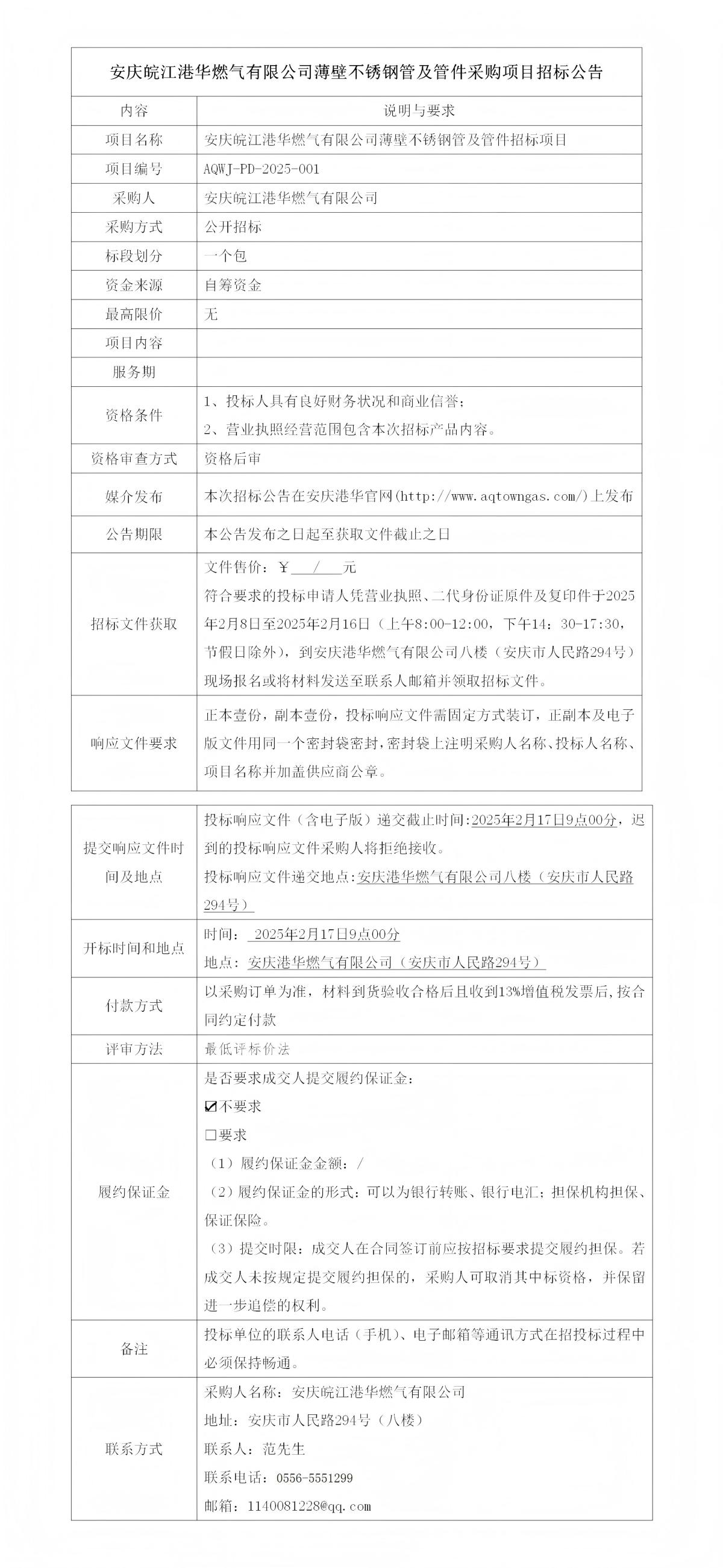安慶皖江港華燃氣有限公司薄壁不銹鋼管及管件采購項目招標(biāo)公告
