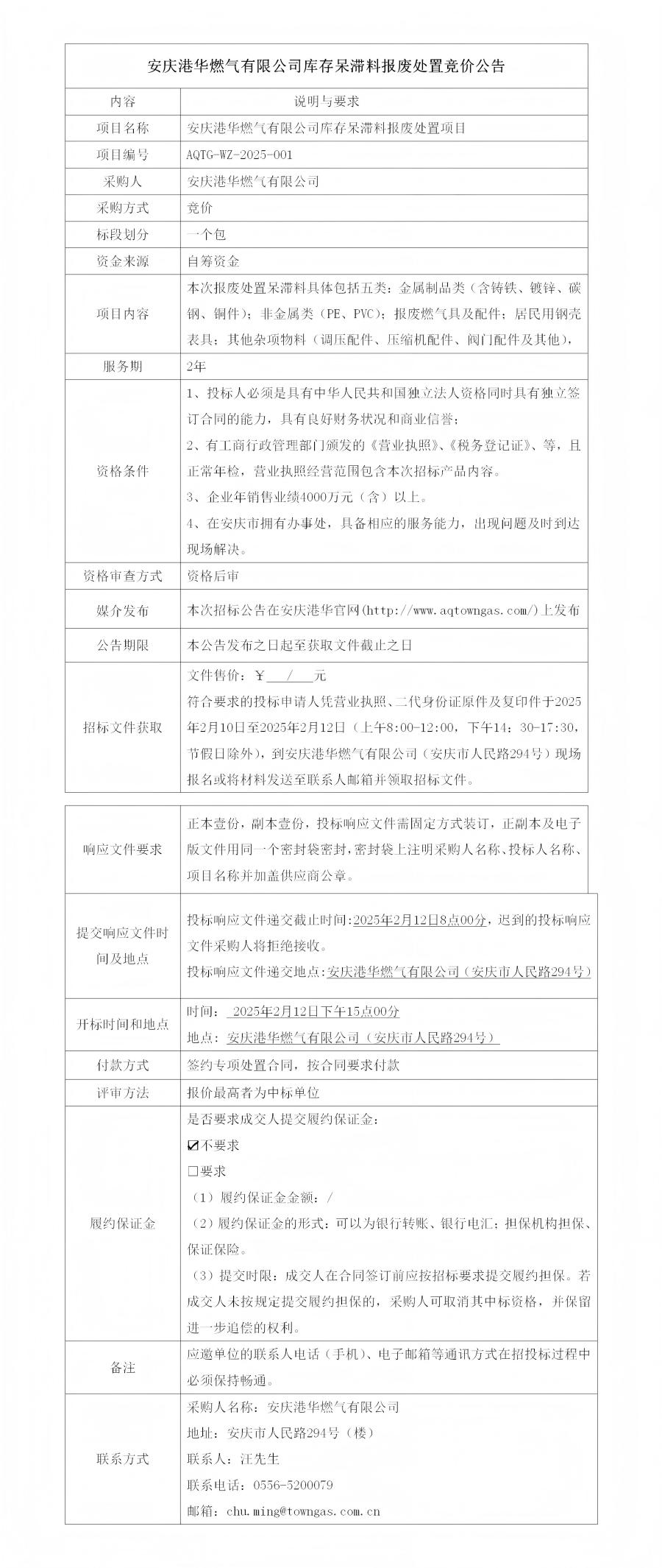 安慶港華燃?xì)庥邢薰編齑娲魷蠄?bào)廢處置競價公告