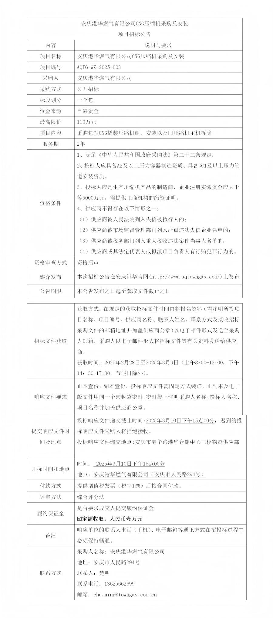 安慶港華燃?xì)庥邢薰綜NG壓縮機(jī)采購(gòu)及安裝項(xiàng)目招標(biāo)公告