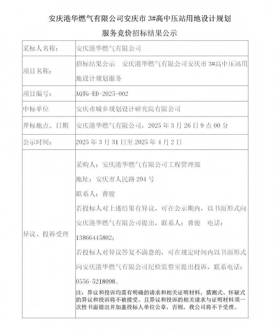 安慶港華燃?xì)庥邢薰景矐c市3#高中壓站用地設(shè)計(jì)規(guī)劃服務(wù)競(jìng)價(jià)招標(biāo)結(jié)果公示