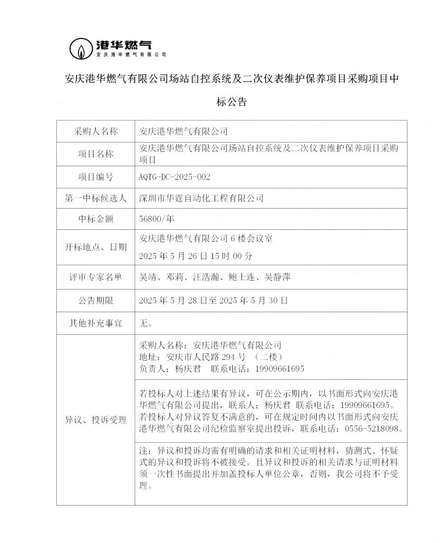 安慶港華燃?xì)庥邢薰緢?chǎng)站自控系統(tǒng)及二次儀表維護(hù)保養(yǎng)項(xiàng)目采購項(xiàng)目中標(biāo)公告