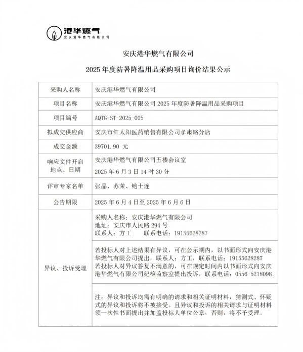 安慶港華燃?xì)庥邢薰?025年度防暑降溫用品采購項目詢價結(jié)果公示