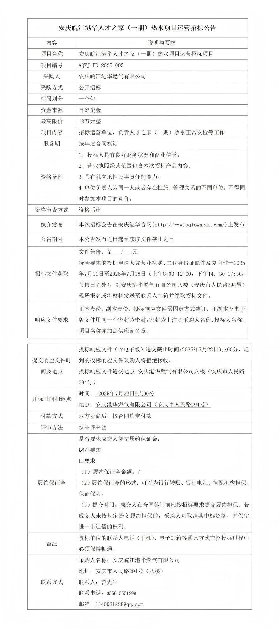 安慶皖江港華人才之家(一期)熱水項目運營招標公告
