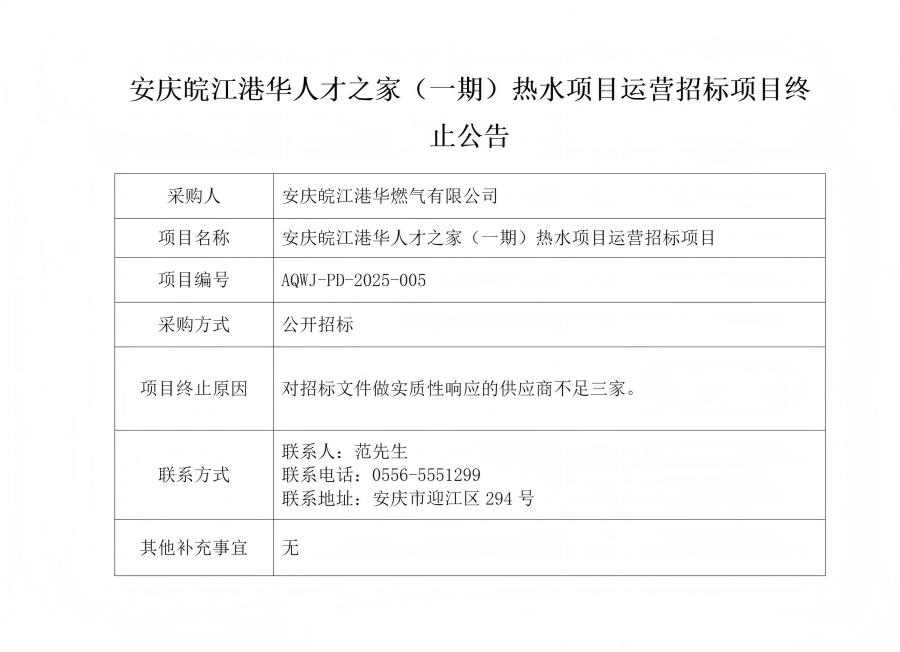 安慶皖江港華人才之家(一期)熱水項目運(yùn)營招標(biāo)項目終止公告