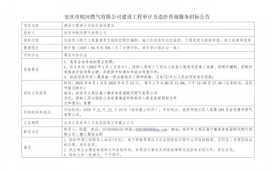 安慶市皖河燃氣有限公司建設(shè)工程審計及造價咨詢服務招標公告