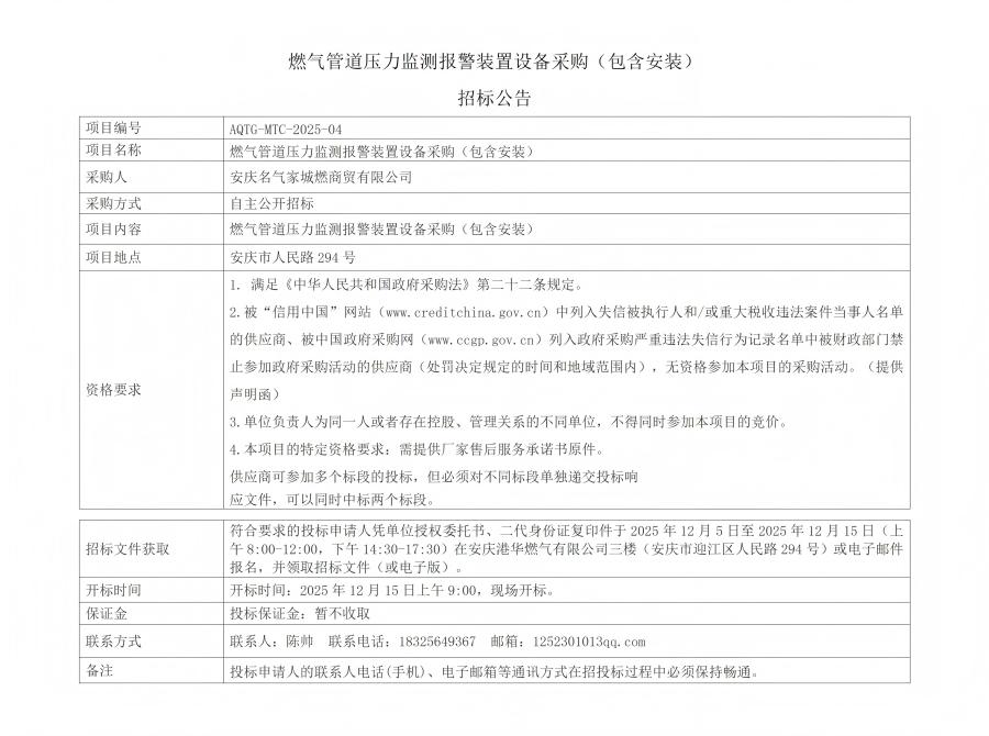 燃?xì)夤艿缐毫ΡO(jiān)測(cè)報(bào)警裝置設(shè)備采購(包含安裝)招標(biāo)公告