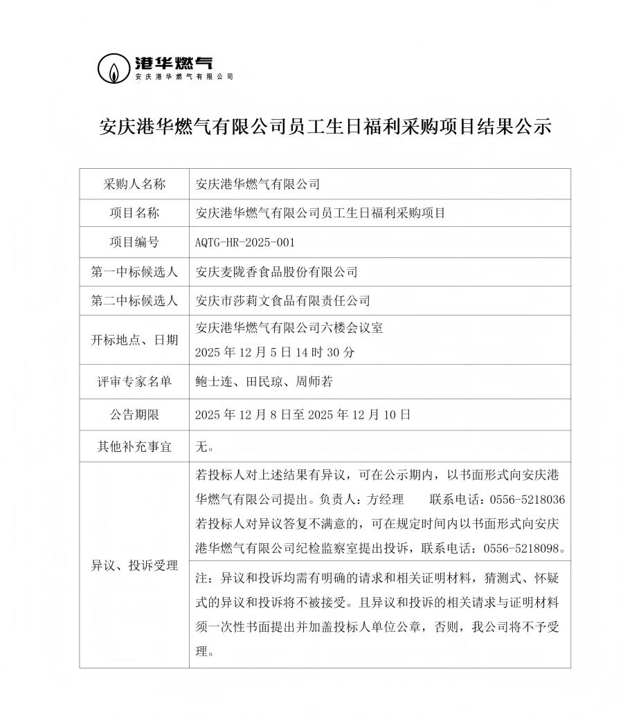安慶港華燃氣有限公司員工生日福利采購項目結(jié)果公示