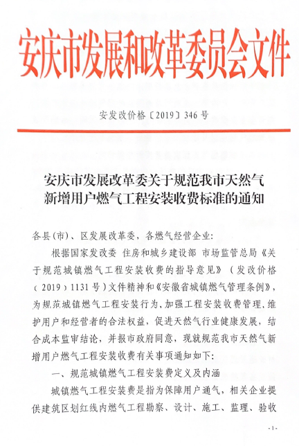 安慶市發(fā)展改革委關(guān)于規(guī)范我市天然氣新增用戶燃?xì)夤こ贪惭b收費(fèi)標(biāo)準(zhǔn)的通知(2019)