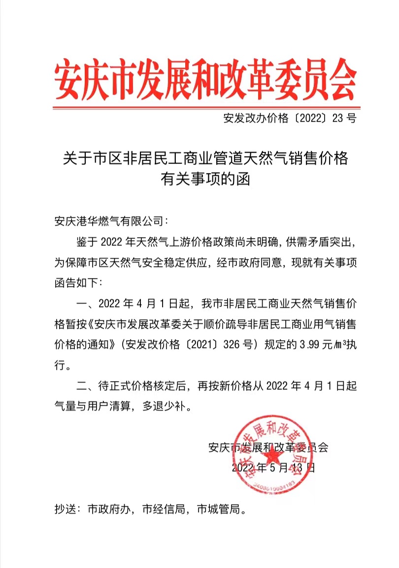 關(guān)于市區(qū)非居民工商業(yè)管道天然氣銷售價(jià)格有關(guān)事項(xiàng)的函(安發(fā)改辦價(jià)格〔2022〕23號)